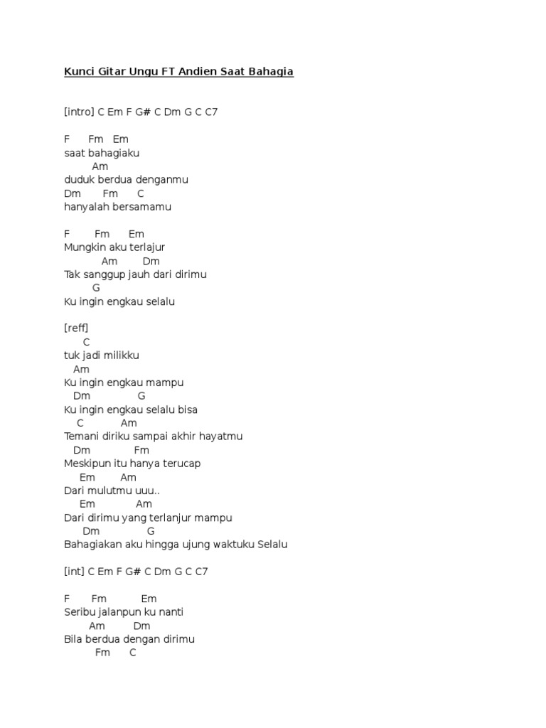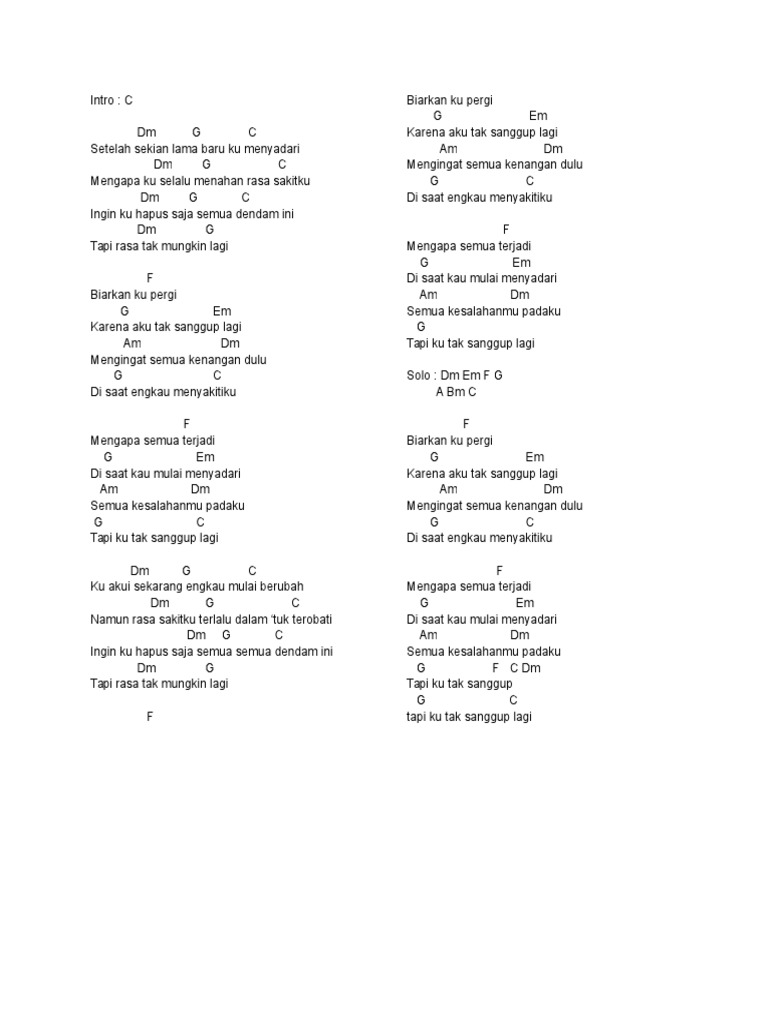 Termenung sendu Ratapi luka yang telah terguris Mengejar bayang Moga terbukanya pintu hati Rindu saat kita Seperti lalu saling menyayangi Namun kau berubah. F Em Dm G bila kamu yang tak pernah sadari. Dm G C setelah sekian lama baru ku menyadari Dm G C mengapa ku selalu menahan rasa sakitku Dm G C ingin ku hapus saja semua dendam ini Dm G tapi rasa tak mungkin lagi Chorus F biarkan ku pergi G Em karena aku tak sanggup lagi Am Dm mengingat semua kenangan dulu G C di.
